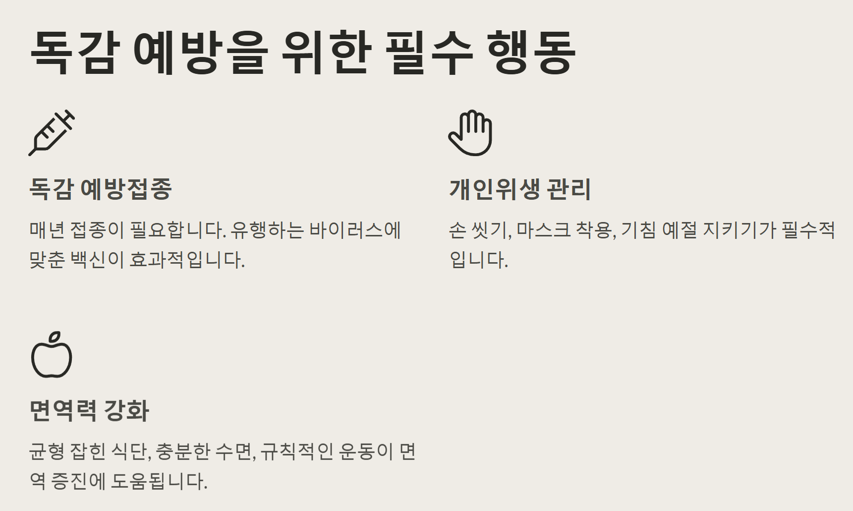 - 독감 예방접종: 가장 효과적인 예방 방법은 매년 독감 예방접종을 받는 것입니다. 유행하는 독감 바이러스의 종류에 따라 백신이 매년 달라지므로, 매년 접종하는 것이 중요합니다.
