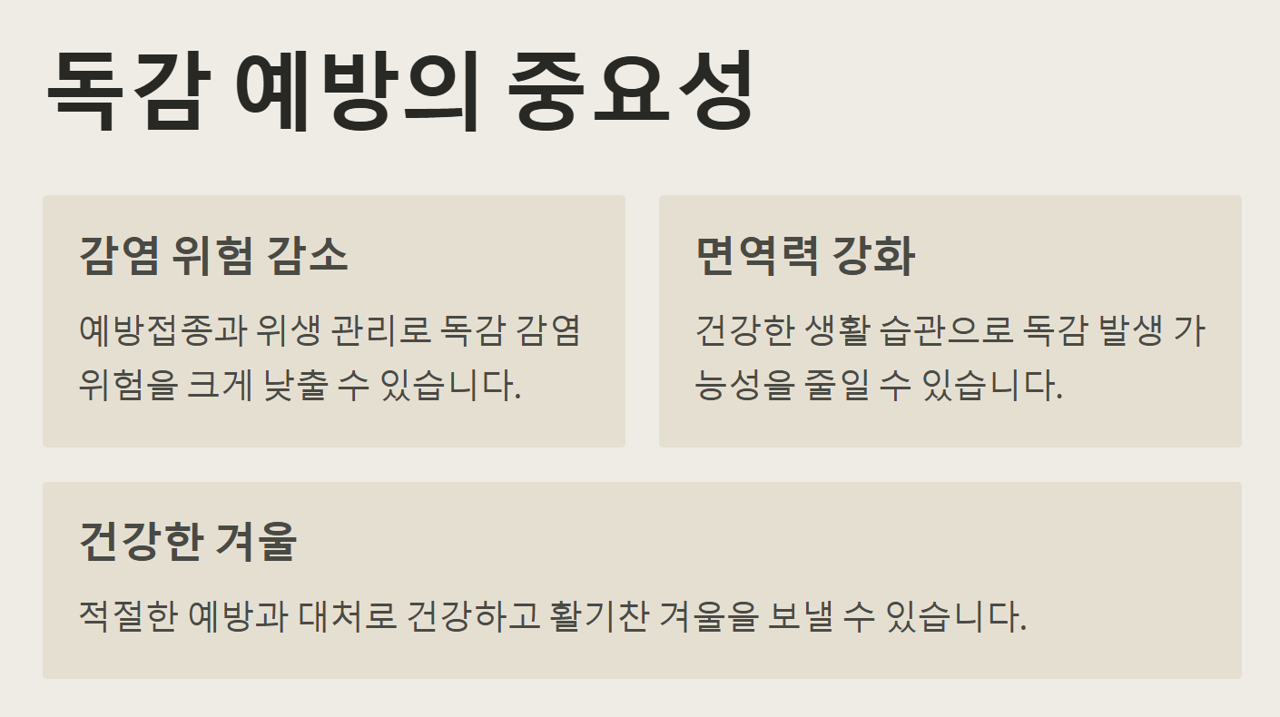독감은 단순한 감기와는 달리, 심각한 합병증을 유발할 수 있어 특히 고령자, 어린이, 임산부, 만성질환자에게는 더욱 위험합니다. 따라서 독감 예방은 건강을 지키기 위한 필수적인 행동입니다.