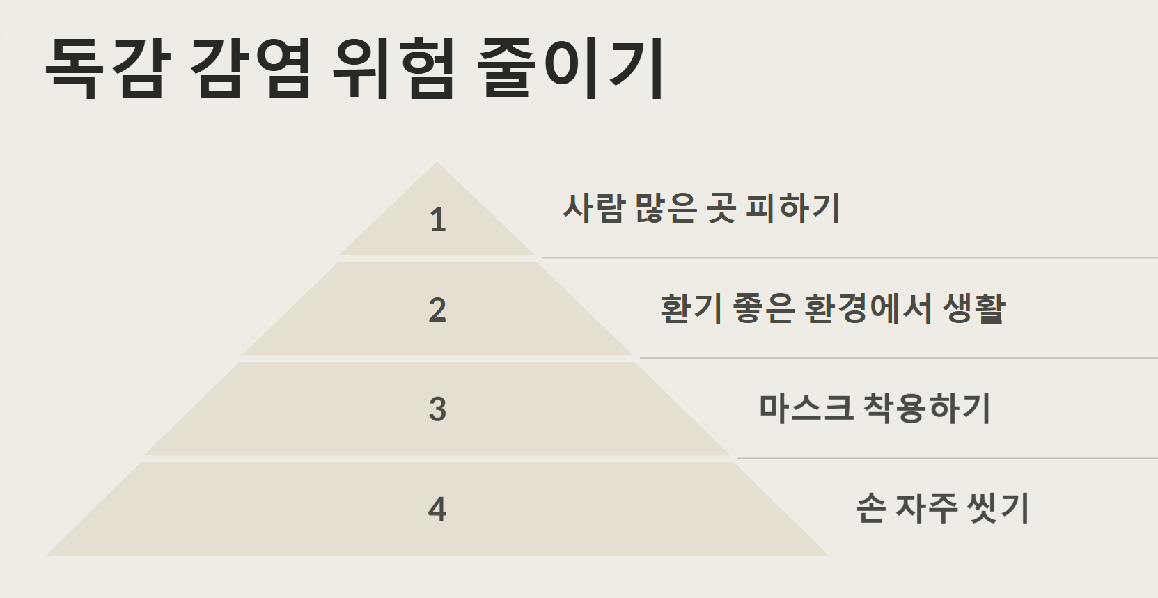 - 사람이 많은 곳 피하기: 독감은 주로 호흡기를 통해 전파되므로, 사람이 많은 곳은 가급적 피하고, 환기가 잘 되는 곳에서 생활하는 것이 좋습니다.