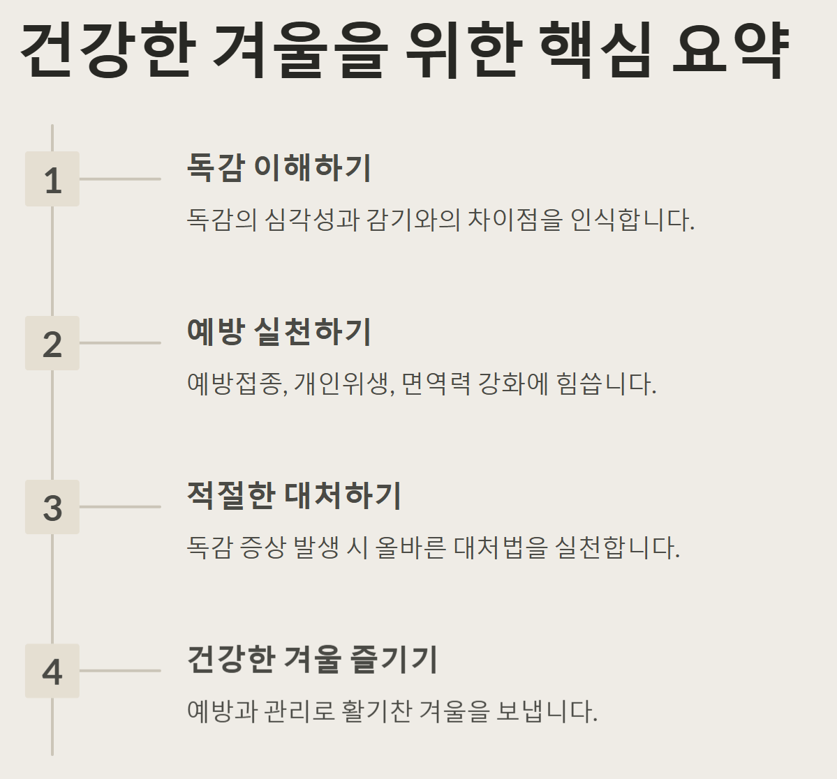 겨울철 독감 예방은 건강한 겨울을 보내기 위한 필수 조건입니다. 독감 예방접종을 비롯하여 개인위생 관리, 면역력 강화 등 다양한 방법을 통해 독감으로부터 자신을 보호할 수 있습니다. 지금까지 겨울철 독감에 대해 알아보았습니다. 독감에 대처하는 방법에 대해 잘 알고 이번 겨울도 걱정없이 독감을 이겨내봅시다!
